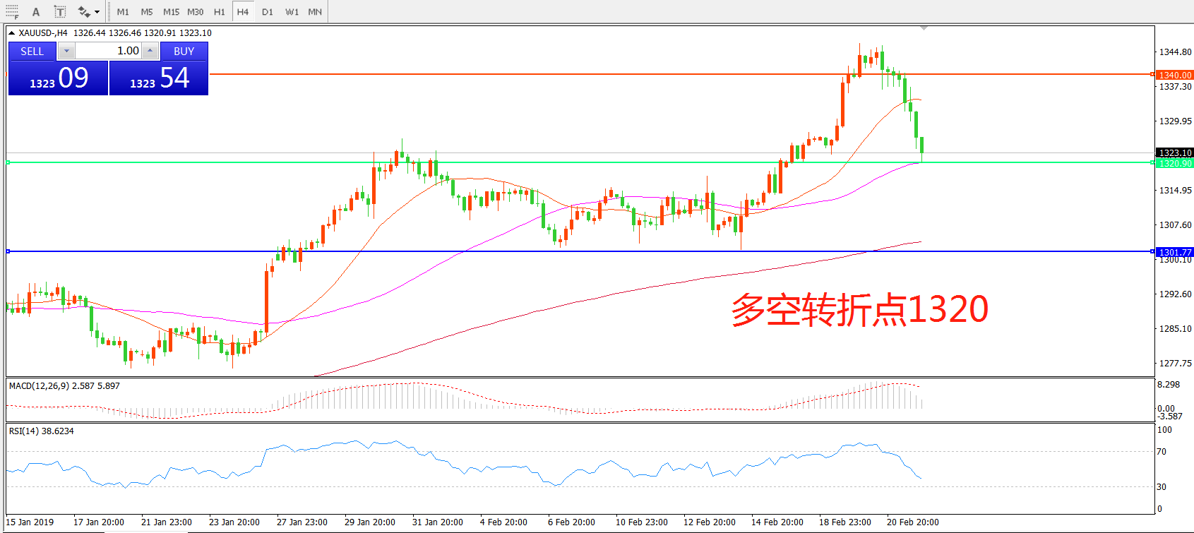 在周三触及10个月高位1346.80美元一线后,现货黄金周四(2月21日)逆转走势,进行深度技术修正。美市盘中,现货黄金下跌逾14美元,至1323.97美元/盎司,跌幅达逾1%。由于近期中美谈判释放良好信号,市场风险情绪有所回落,金价目前的回落更多是由获利回吐的造成的,逢低做多依然为主要思路。