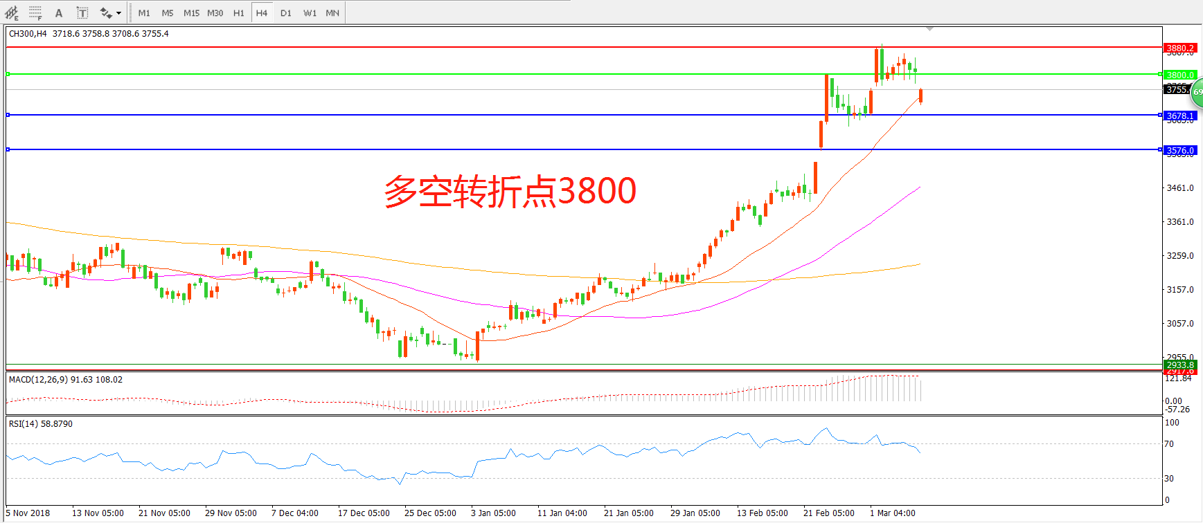 4小时图看,CHINA300中华指数大幅低开,跌破前期支撑3800一线,均线系统依然呈现多头排列, MACD红柱走平,RSIZ指标拐头,预计日内小幅下跌为主。