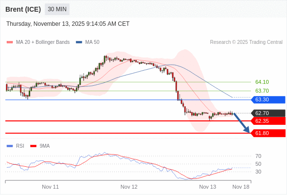 在 63.30 之下,看跌,目标价位为 62.35 ,然后为 61.80 。