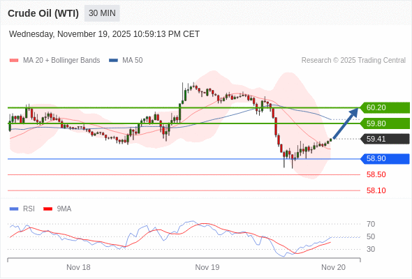 在 58.90 之上,看涨,目标价位为 59.80 ,然后为 60.20 。