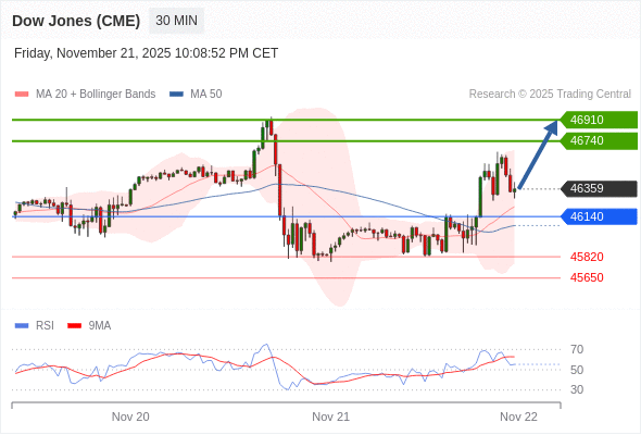 在 46140 之上,看涨,目标价位为 46740 ,然后为 46910 。