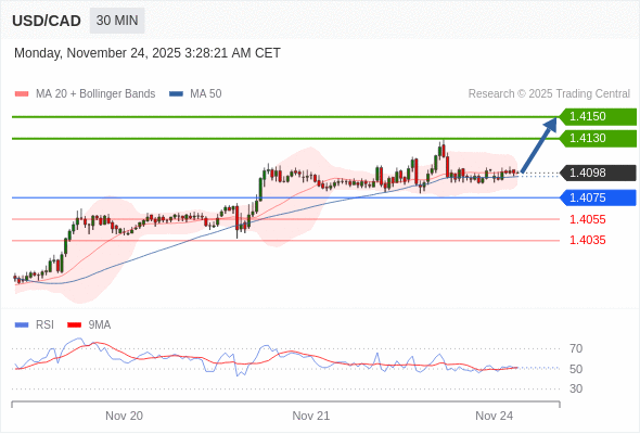 在 1.4075 之上,看涨,目标价位为 1.4130 ,然后为 1.4150 。