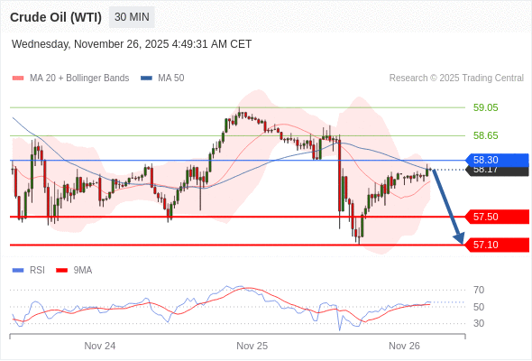 在 58.30 之下,看跌,目标价位为 57.50 ,然后为 57.10 。