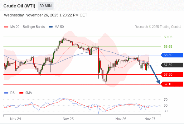 在 58.30 之下,看跌,目标价位为 57.50 ,然后为 57.10 。