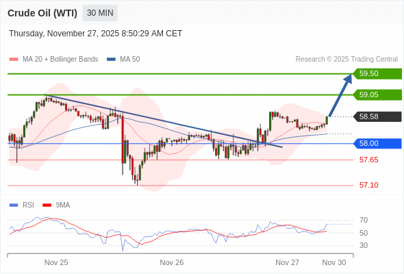 在 58.00 之上,看涨,目标价位为 59.05 ,然后为 59.50 。