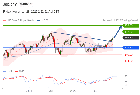 在 146.70 之上,看涨,目标价位为 162.00 ,然后为 168.00 。