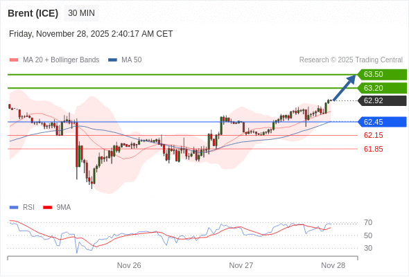 在 62.45 之上,看涨,目标价位为 63.20 ,然后为 63.50 。
