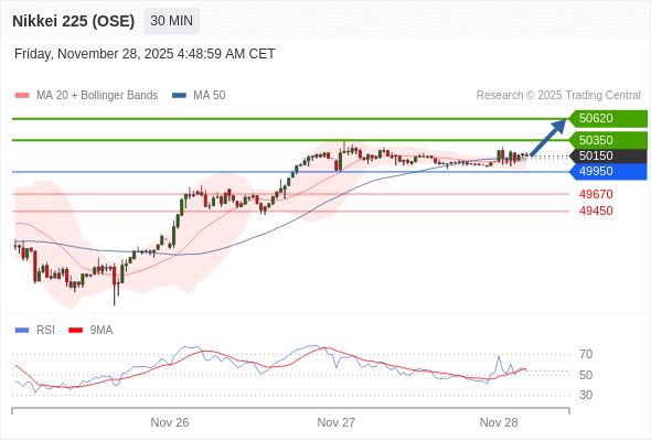 在 49950 之上,看涨,目标价位为 50350 ,然后为 50620 。