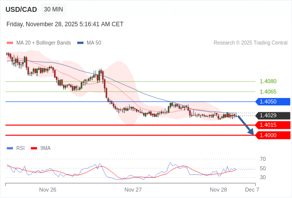 在 1.4050 之下,看跌,目标价位为 1.4015 ,然后为 1.4000 。