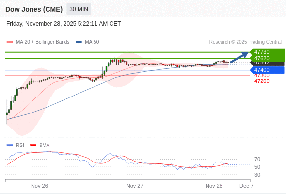 在 47400 之上,看涨,目标价位为 47620 ,然后为 47730 。