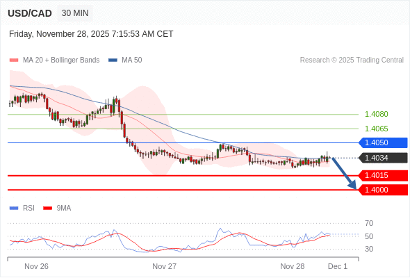 交易策略: 在 1.4050 之下,看跌,目标价位为 1.4015 ,然后为 1.4000 。