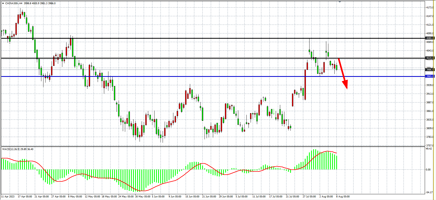 4小时图看,沪深300持续受阻在4000点之下,MACD量能于零轴上有所走弱,压力关注4020-4080附近。支撑关注3965-3900。