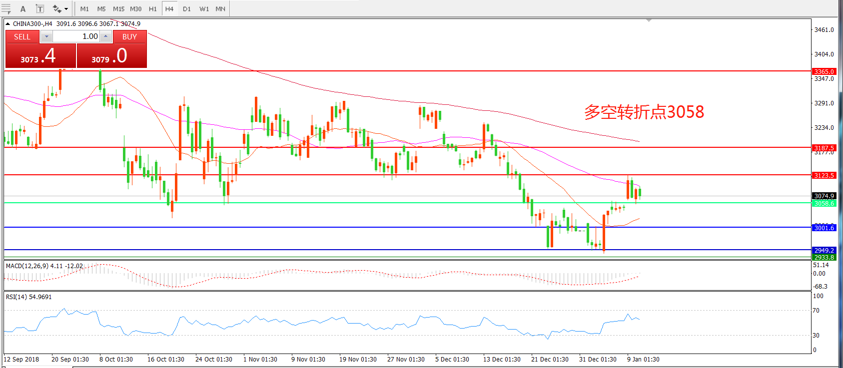 1小时图看,CHINA300中华指数收复3000整持续上行,冲击上方阻力失败后回吐大部分涨幅,均线系统走平, MACD绿柱增加,短线震荡整理概率较大。