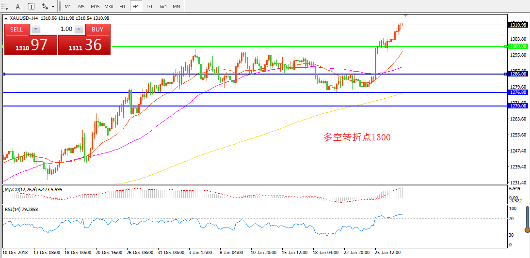 4小时图看,黄金在1300附近稳步上升,昨日突破1310阻力,整体走势偏多。