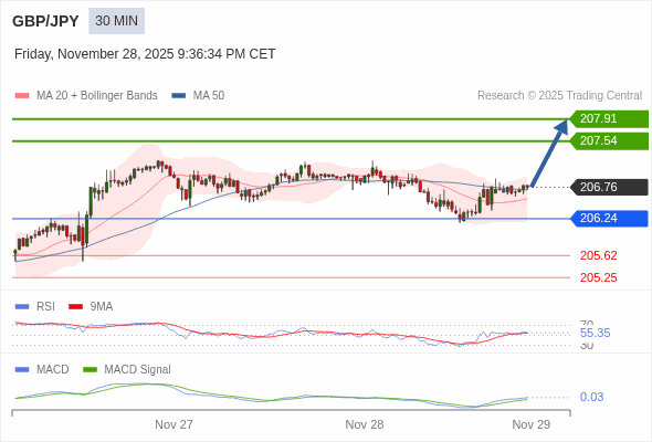 英镑/日元 当日内 : 看涨,当 206.24 为支撑位。