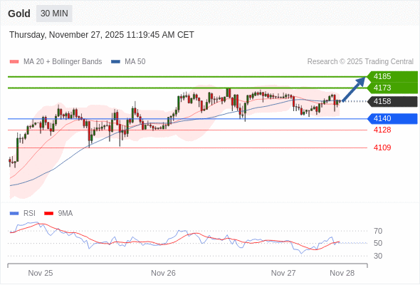 在 4140 之上,看涨,目标价位为 4173 ,然后为 4185 。