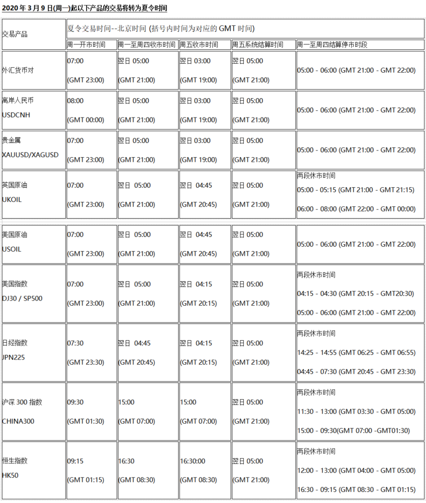 2020夏令时交易时间通知